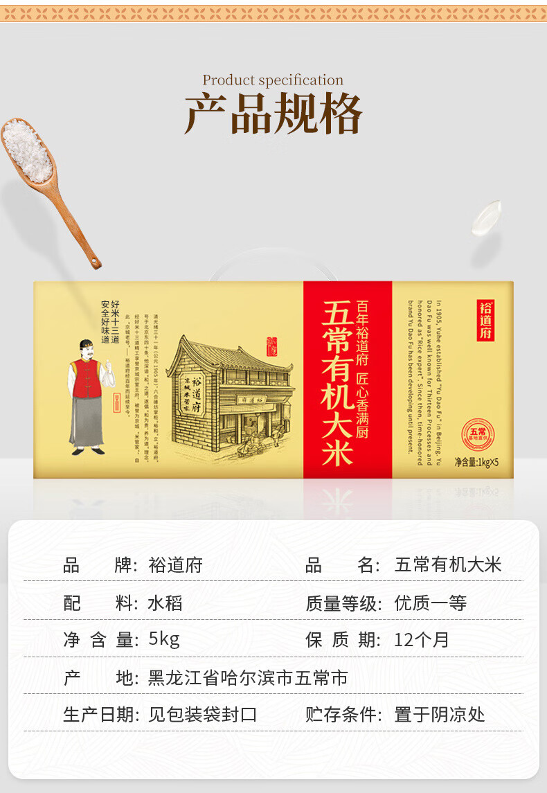商品名称:裕道府大米5kg东北核心产区5公斤团购福利礼盒 五常有机大米(匠心) 5kg*1盒