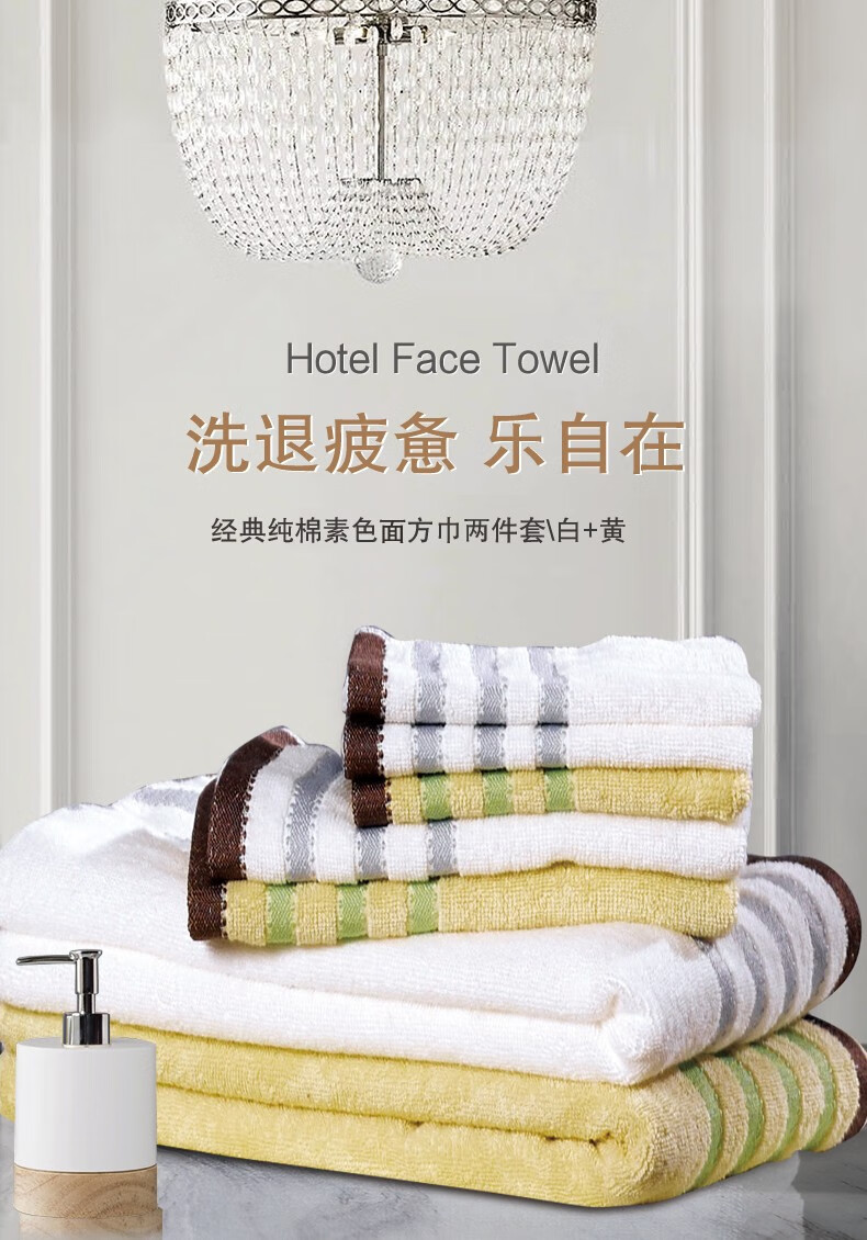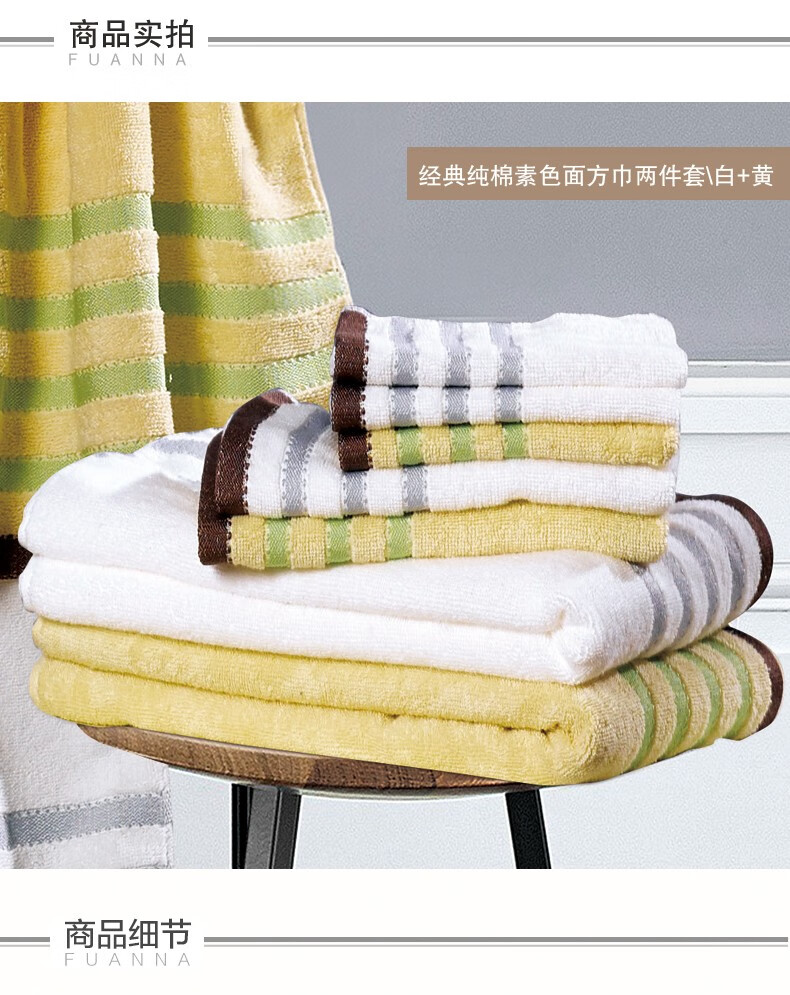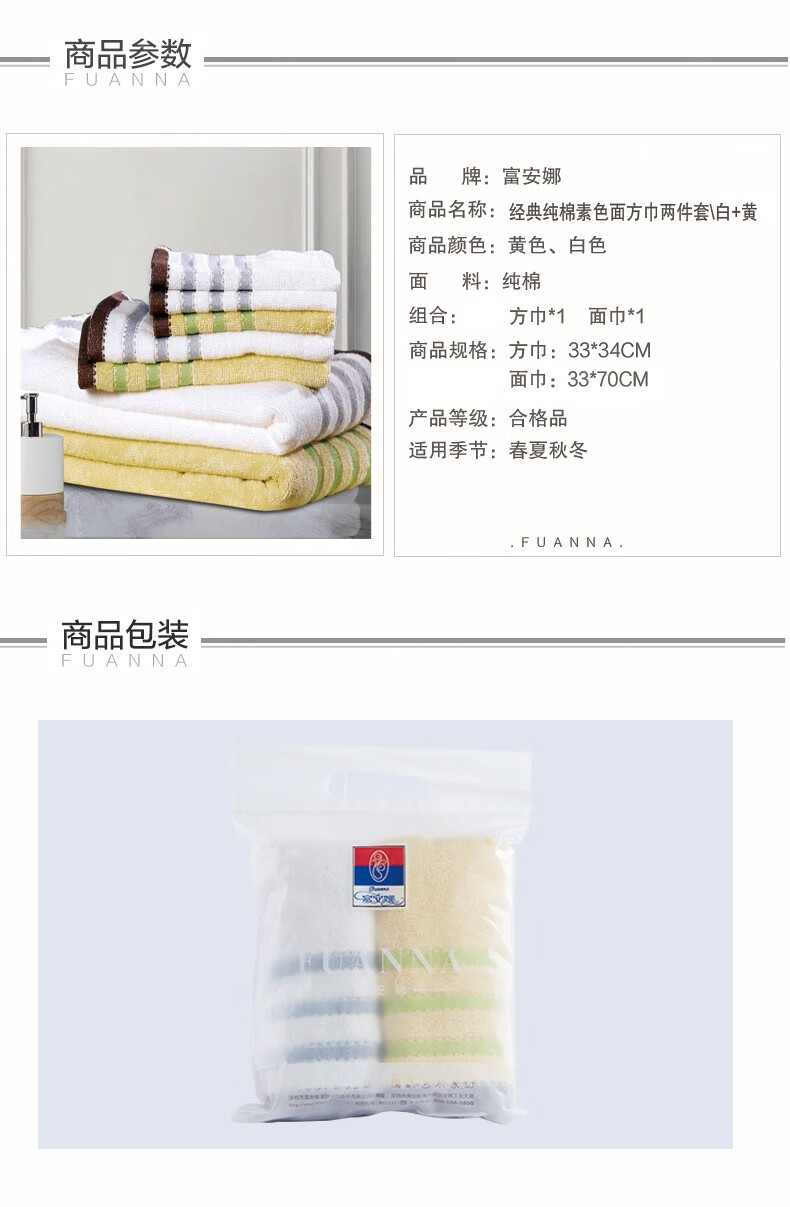 商品名称:富安娜经典纯棉素色面方巾两件套/白+黄
